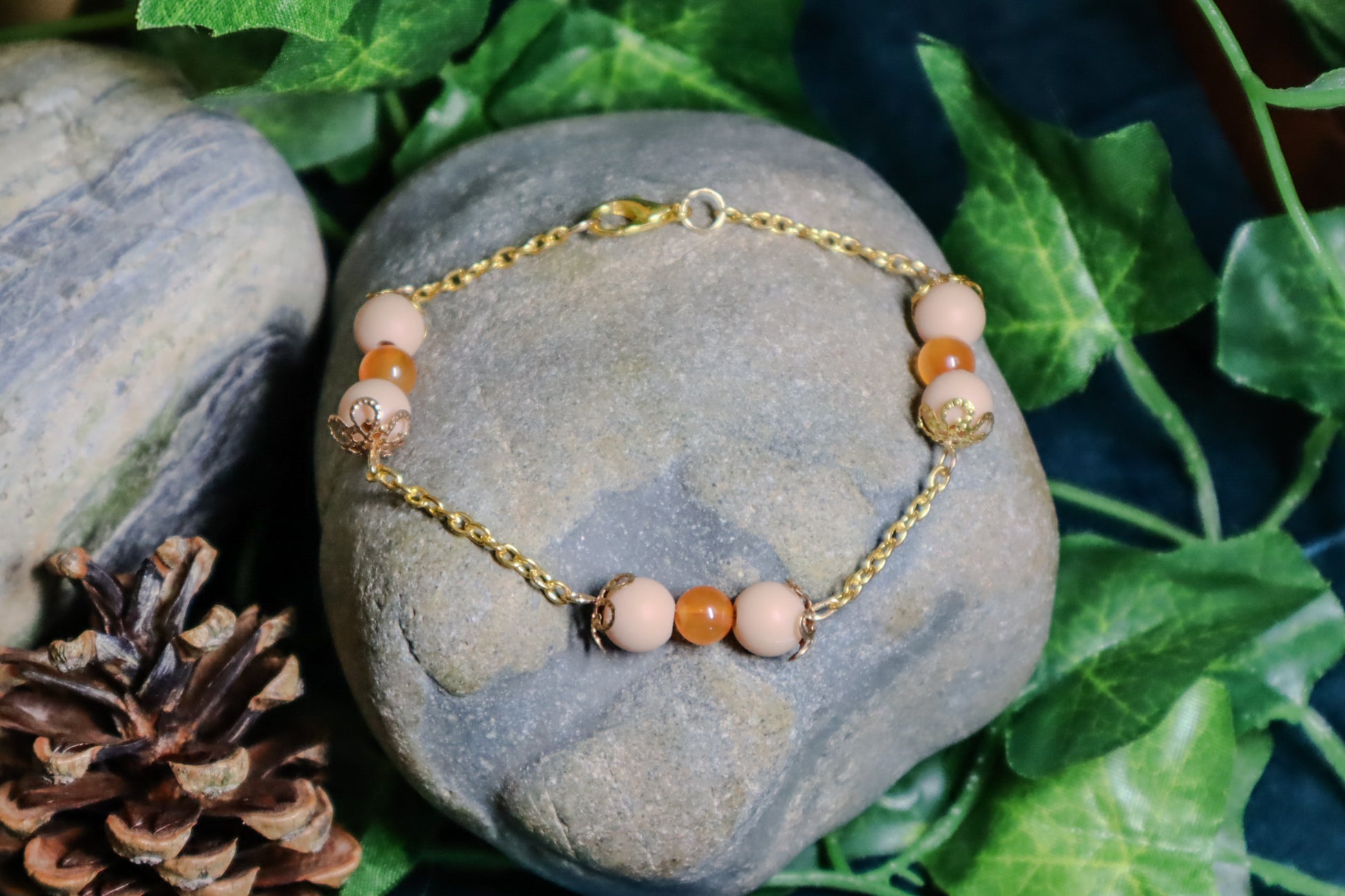Ce délicat bracelet couleur or est orné de 3 perles de cornaline, réparties en trois groupes de trois perles disposés de chaque côté du poignet.