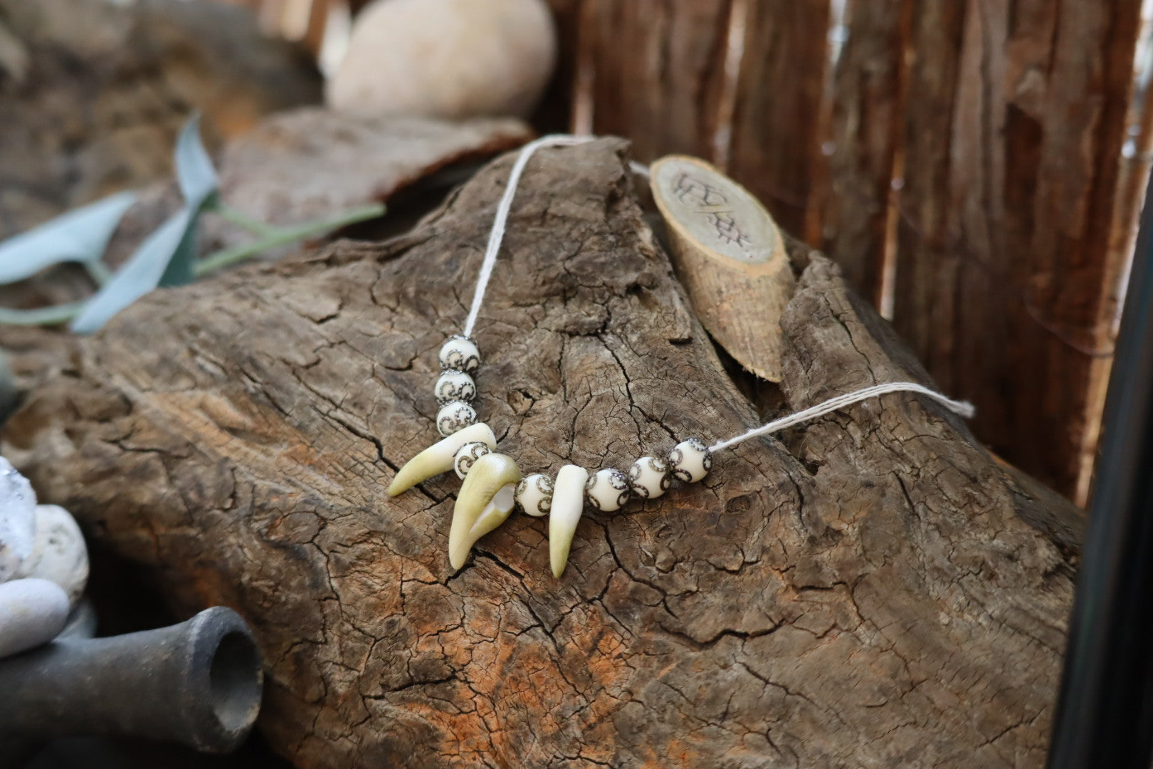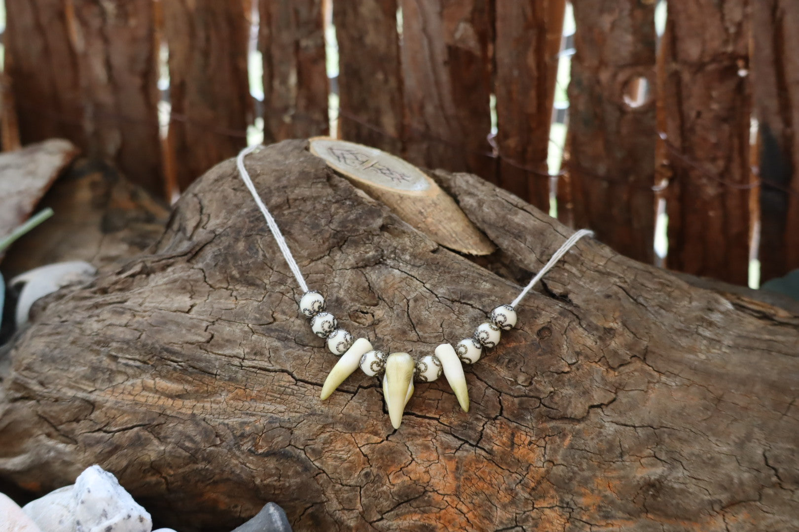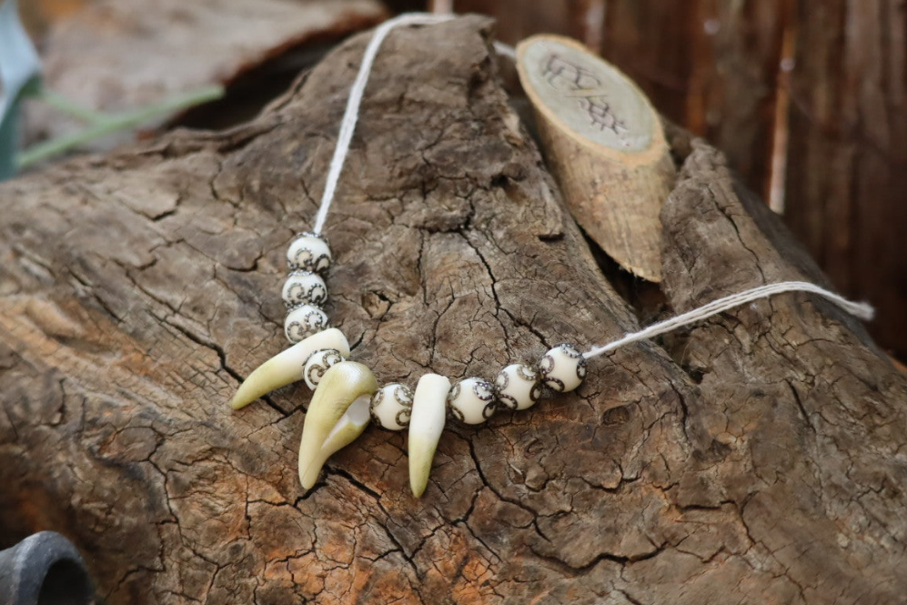 De chaque côté, deux crocs représentent la force animale, l’instinct primitif et la protection. Ils rappellent l’animal totem qui veille sur celui ou celle qui le porte.