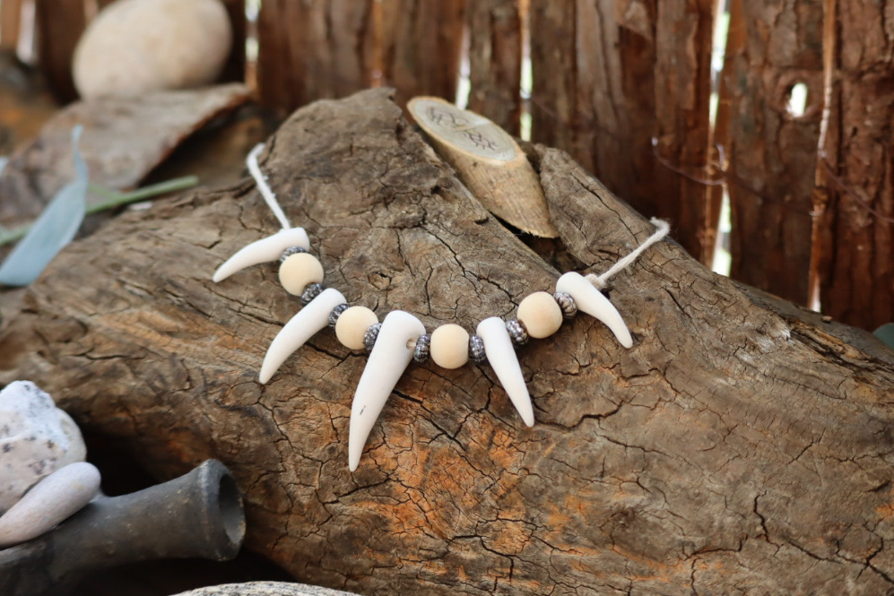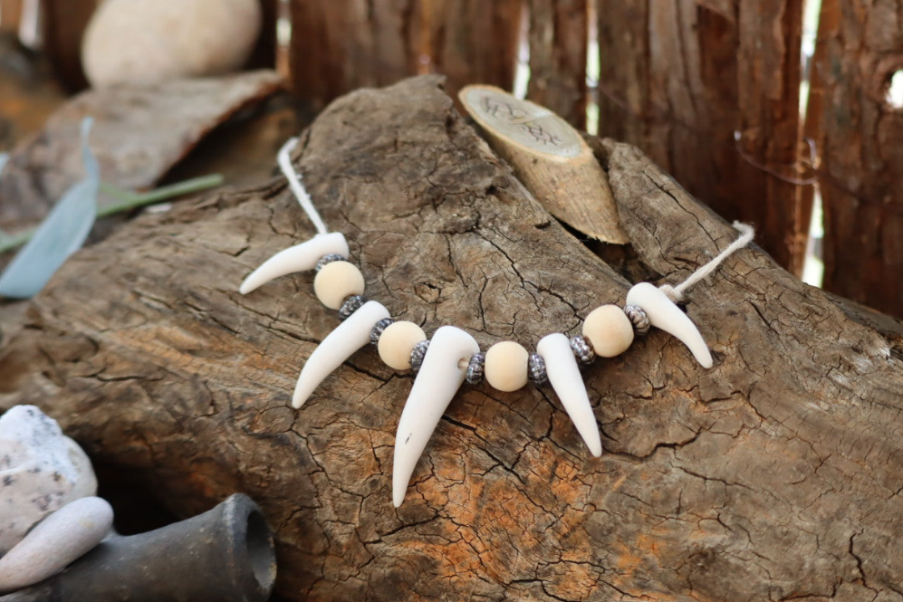 Ce collier au style sauvage et mystique est composé de fausses dents blanches en forme de crocs, symboles de force, de protection et d’instinct primitif.