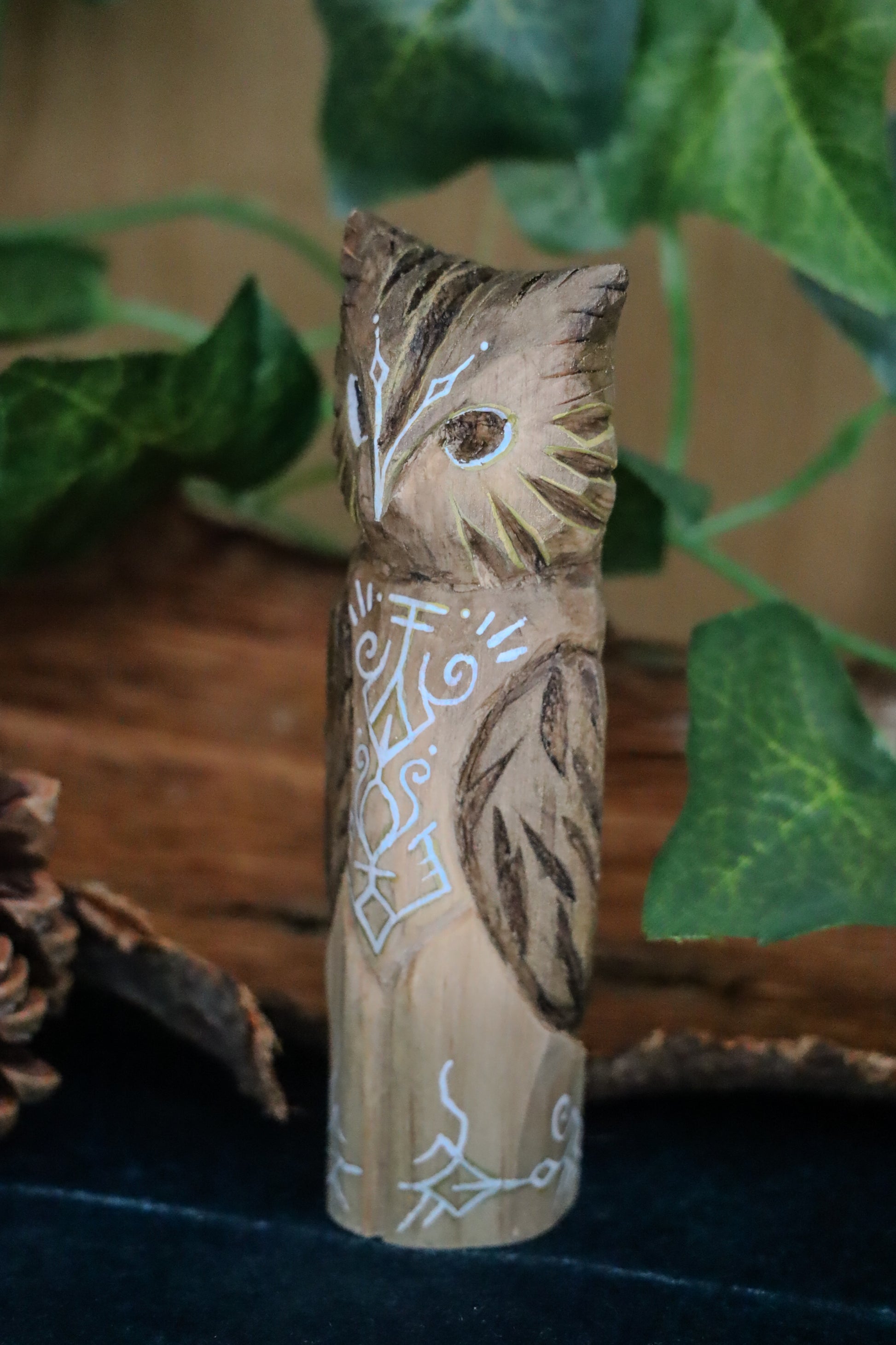Ce Lumaë est un petit totem sacré, façonné en bois de pin, symbole de protection, de sagesse et d’éternité. Il prend la forme d’une chouette, gardienne des mystères et messagère entre les mondes.